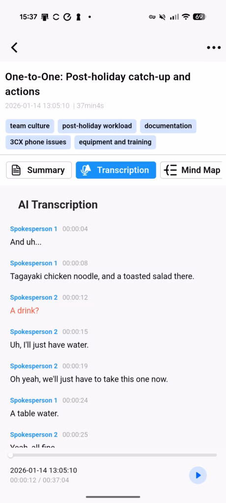 The transcription text is segmented at regular intervals, making it easy to read and navigate. You can tap on any section to play back that specific part of the recording, which is useful when reviewing content. This matches Plaud’s implementation.