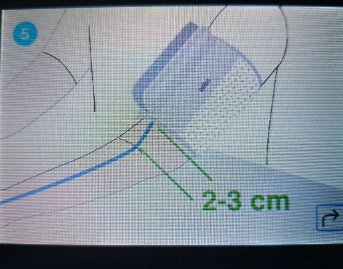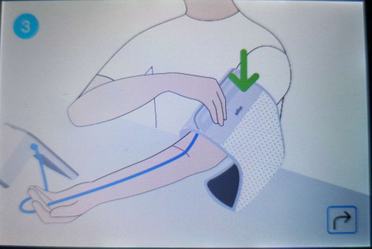 To take your blood pressure, you can press the heart button to the left or do it via the menu. The unit will provide a visual guide on how to best take your reading. You should be sat down, with your arm flat on rest/table in front of you and a 2-3cm gap between the crease in your elbow and the bottom of the cuff.