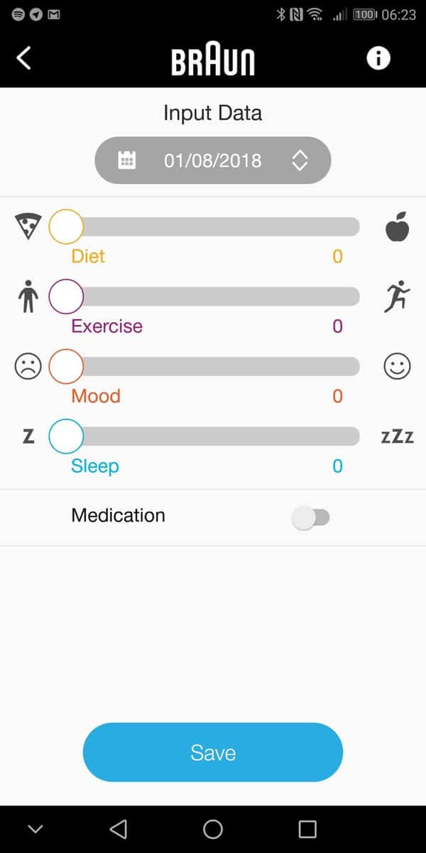 The app itself is decent enough; it is quite basic in what it does. You get an easy way to view your readings as well as a calendar and graph view similar to the device itself. You can set up reminders and then you can also add additional data such as diet, exercise, mood, sleep and medication.