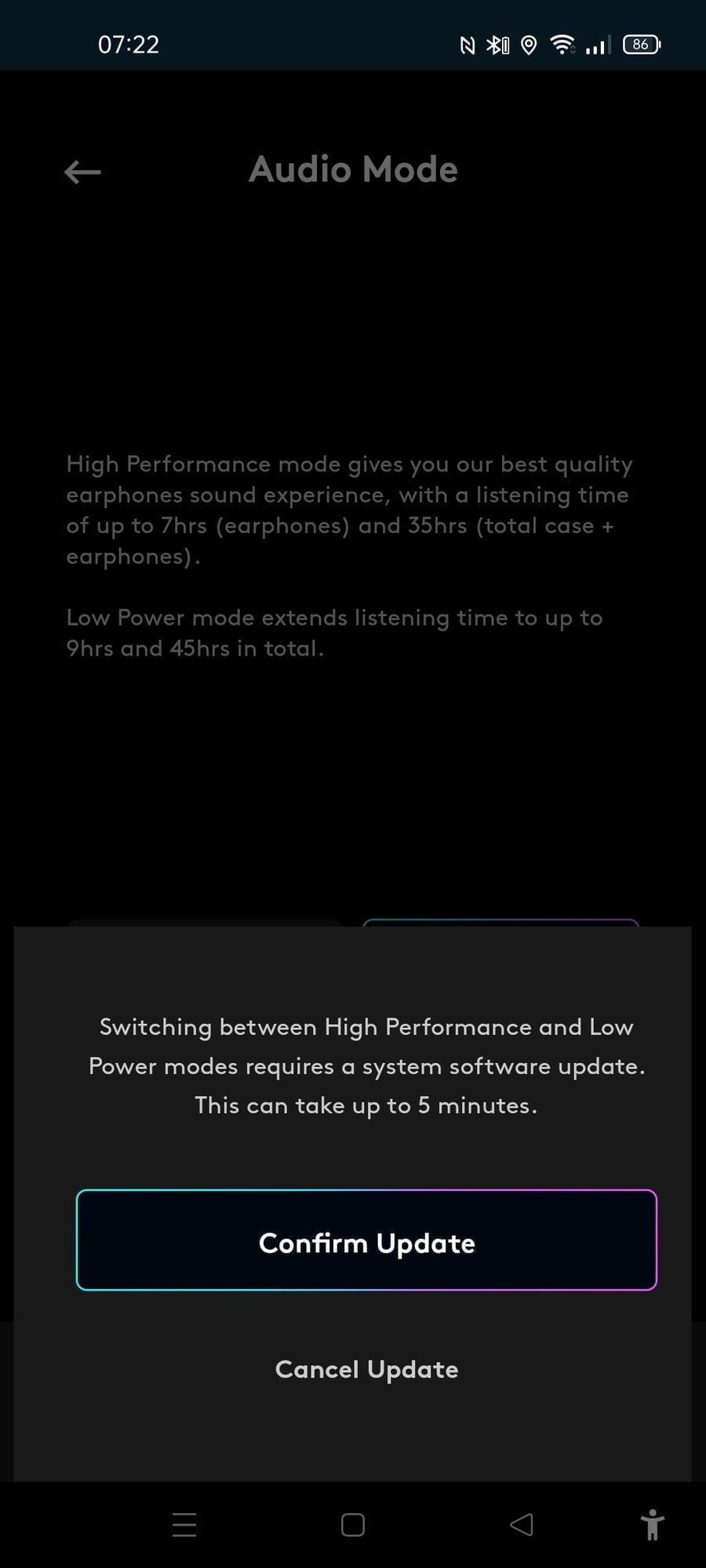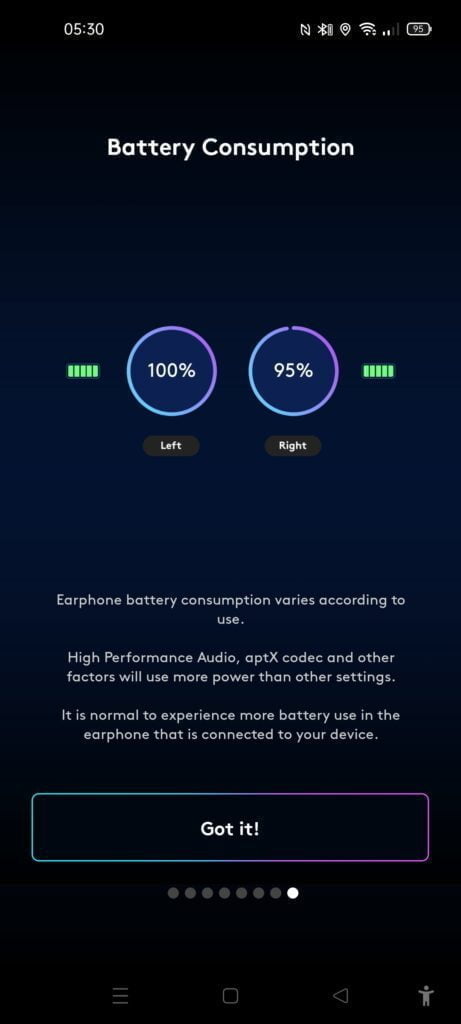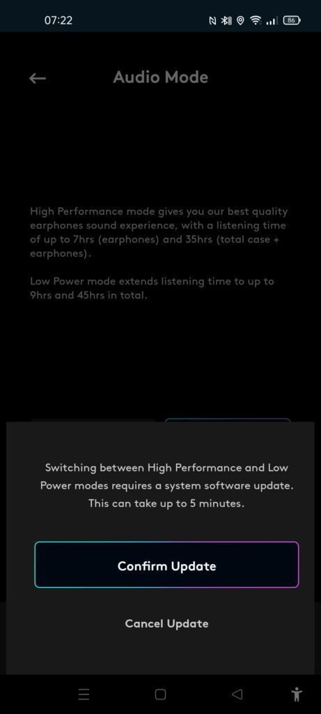 Out of the box, and what you are likely always going to use, these use high-performance mode, which gives closer to 7 hours use. This is still on the higher end of normal and similar to many premium earbuds without ANC on such as the Jabra Elite 75T and 85T.