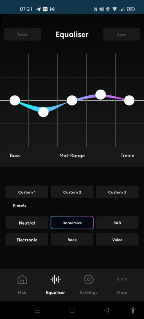I found the neutral EQ worked best for myself, while rock and electronic did bring out the bass a little bit too much. For those that don’t like the emphasised bass, I thought the immersive offered the best balance, while the voice option massively reduces the bass while emphasising the upper mids.