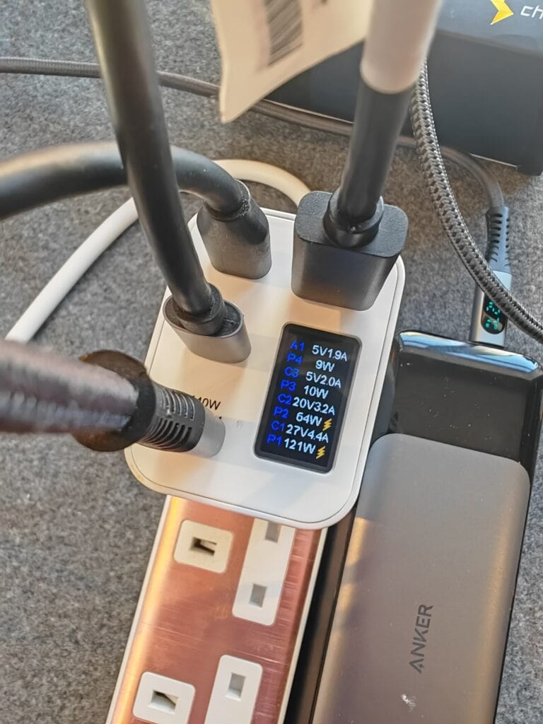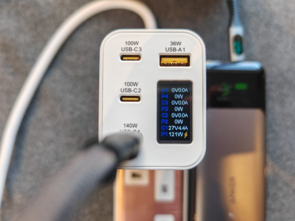 I used the Anker to test each port individually and checked the OLED display against the display on the power bank and also the display on the USB4 cable I was using. The 140W port capped out at 125W, which matches the performance from Ugreen Nexode 140W. My best guess is that the Anker only takes 140W when completely drained.