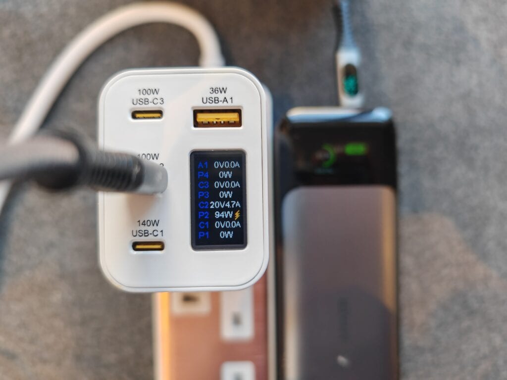 Then on the top of the charger, you have the three USB-C ports, a USB-A port and the OLED screen.