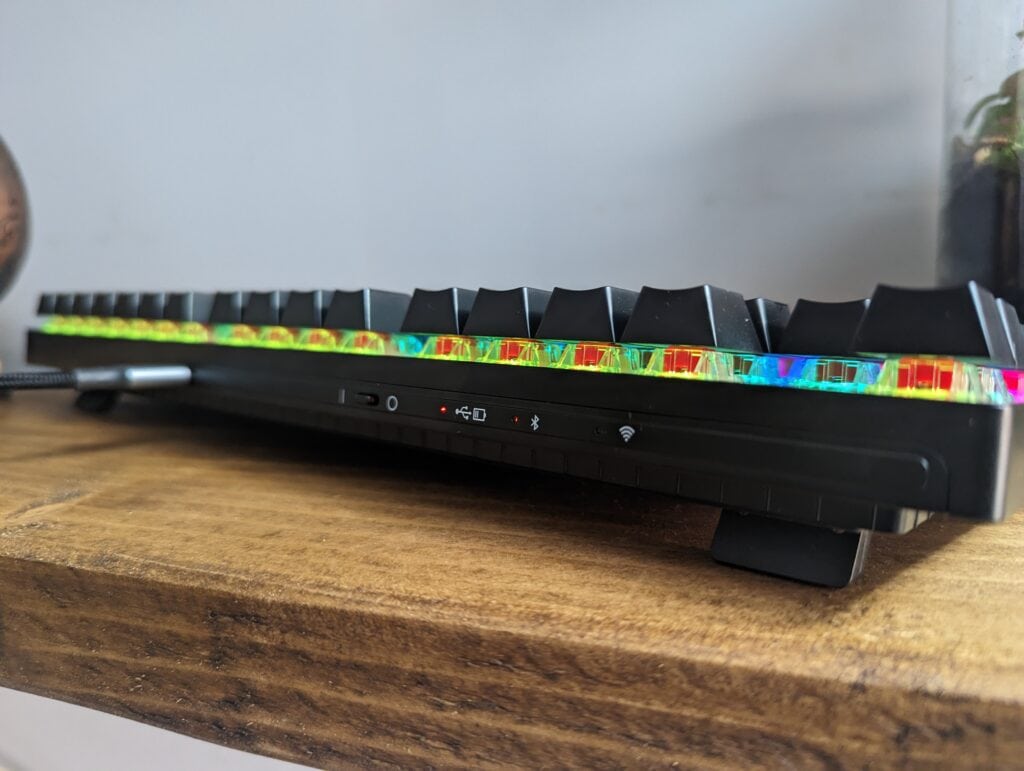 On the keyboard’s top edge are LEDs and icons for the connectivity type, charging state and toggle for power. There is then a USB-C port for wired connectivity. When wired, the keyboard remains on and connected regardless of whether the power switch is on or off.