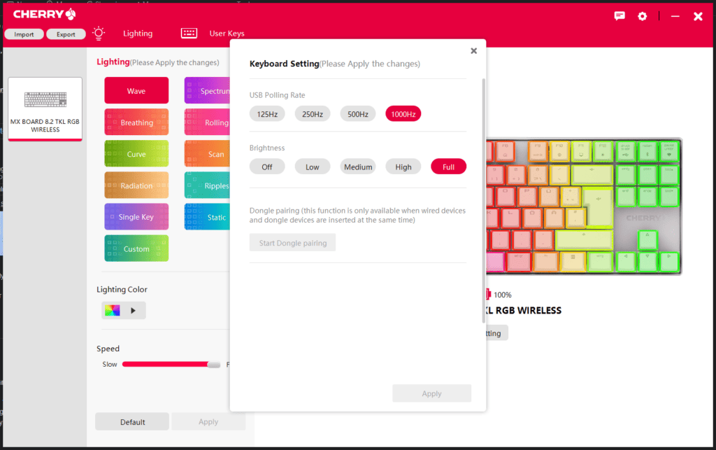 Finally, under the KB settings button, you can adjust the USB polling rate and the RGB brightness, including turning it off.