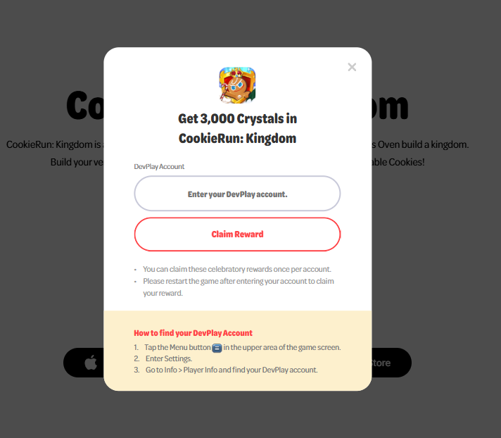 Additionally, you can claim 3,000 Crystals by visiting the Studio Kingdom website and clicking on the Sugar Gnome icon that holds a crystal in its hand, located just to the right of the Cookie Run: Kingdom text. With this code redemption, I had to use my email address rather than the player ID.