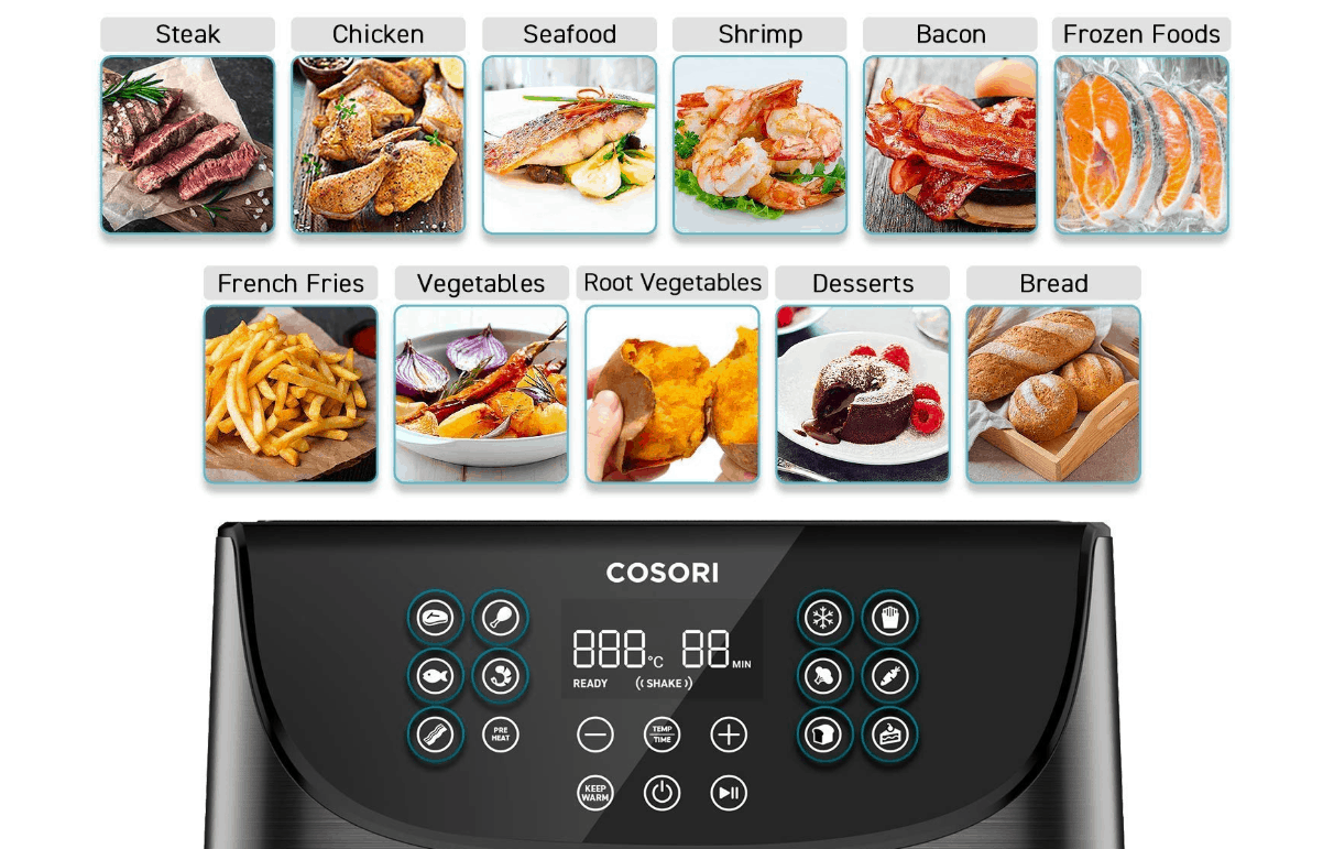 Unique to the Cosori Air Fryer: a helpful Shake reminder, letting you know when to shake the contents for an even fry. Try the Keep Warm function if you need your food well kept for a while.