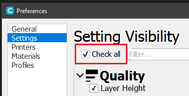 For potentially new users of Creality Slice/ Cura, I recommend selecting this option to ‘Check All’ settings; this allows you to view all options in the advanced print settings menu. Additionally, I like having ‘Slice Automatically’ enabled, though this could cause some lag on slower machines or larger, more complex prints.
