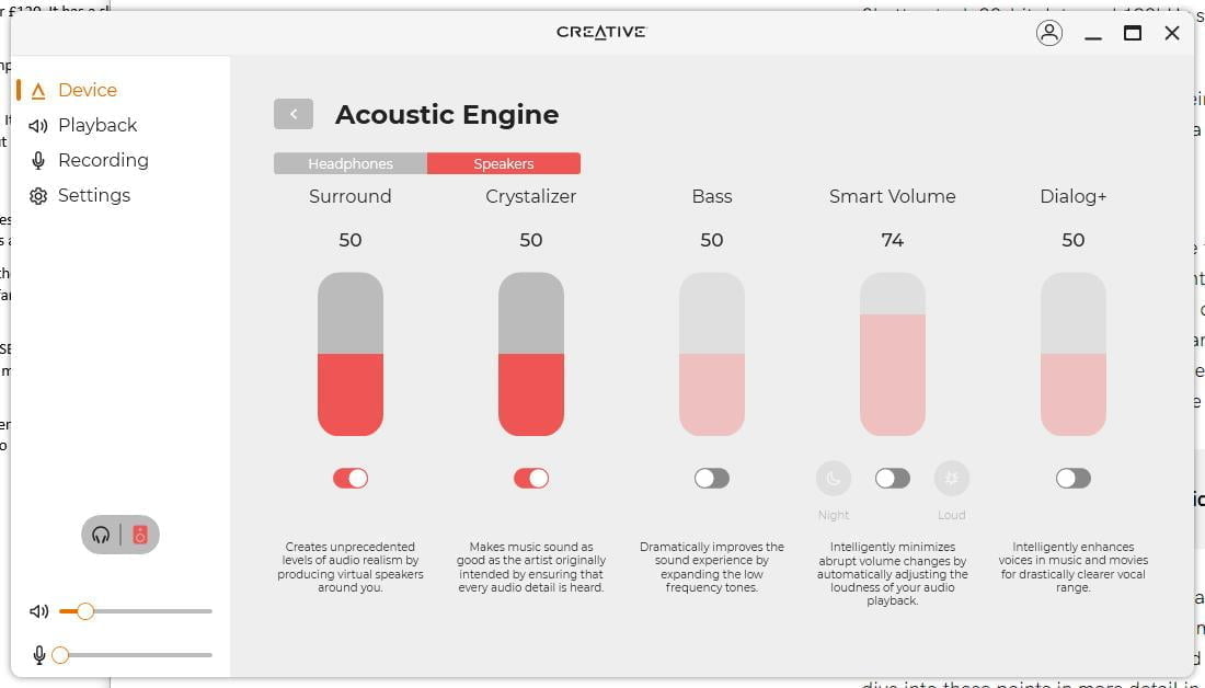As much as I like the app free experience of the FIIO, the Creative App allows better control of how things sound. I can bypass software processing all together or tweak things to my liking with the acoustic engine.