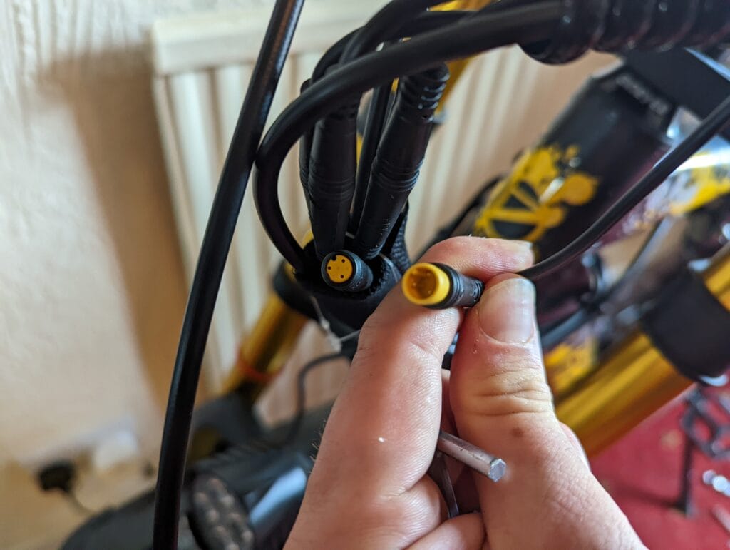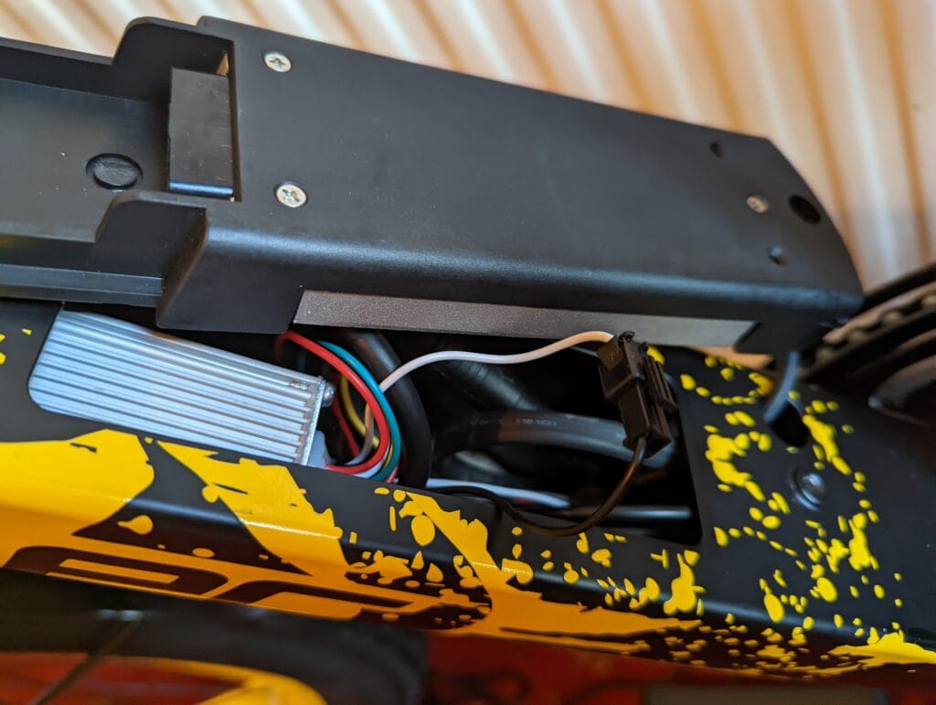 Then, the motor is limited by a cable is contained within the frame with all the other electronics. It is easy enough to access, you need to remove the battery and unscrew the part where it mounts, which exposes the electronics underneath. There is then a black and white cable you can disconnect.