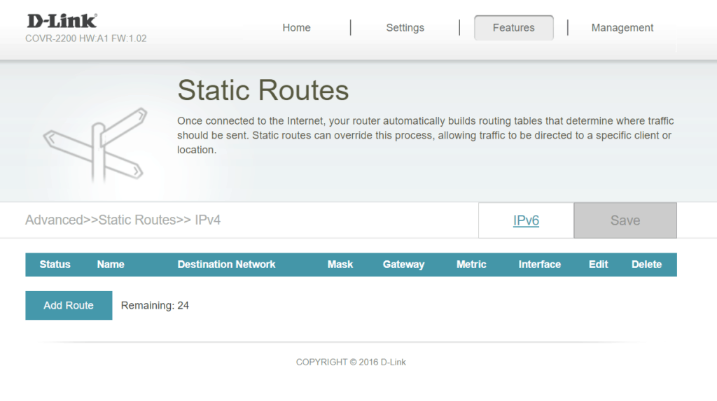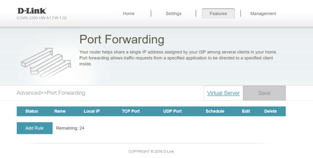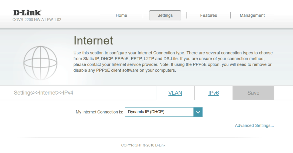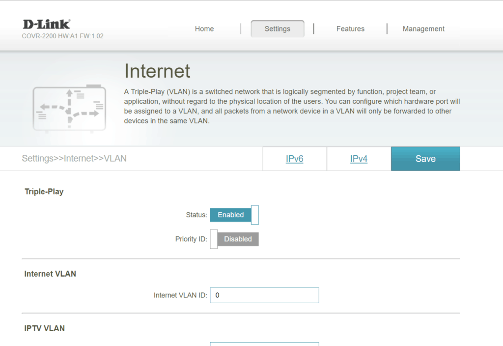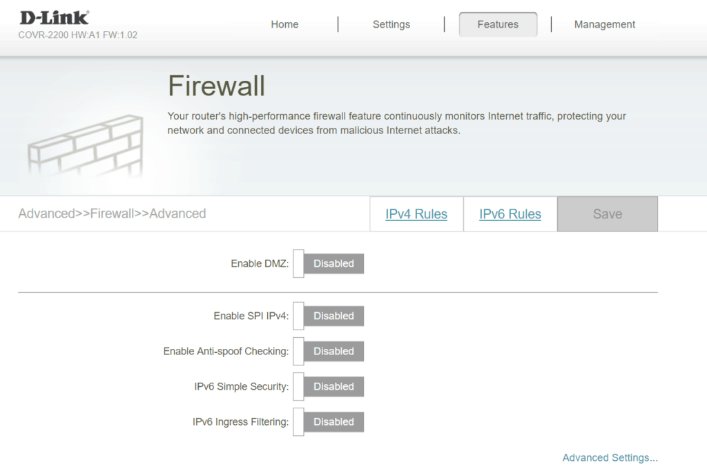 Under the features tab, you have enough options to accommodate most requirements comfortably. This even includes a VLAN option allowing you to separate Internet, IPTV and VOIP. There are also various firewall options including a DMZ, anti-spoof checking, and IPv6 Simple security.
