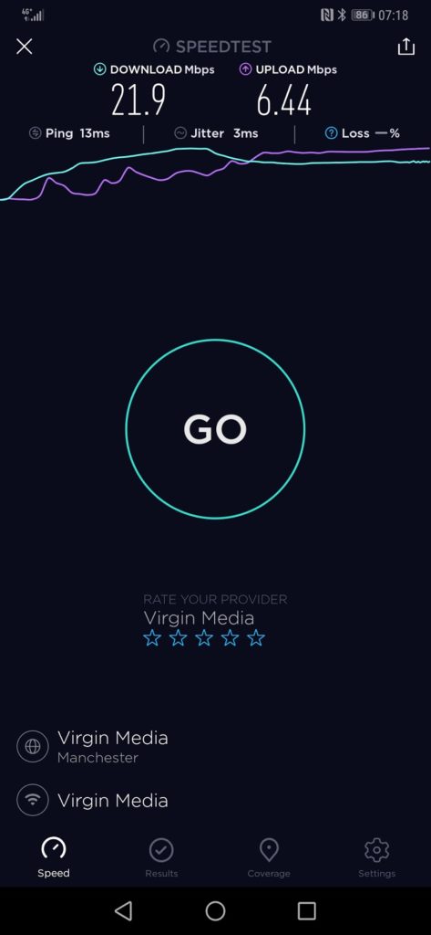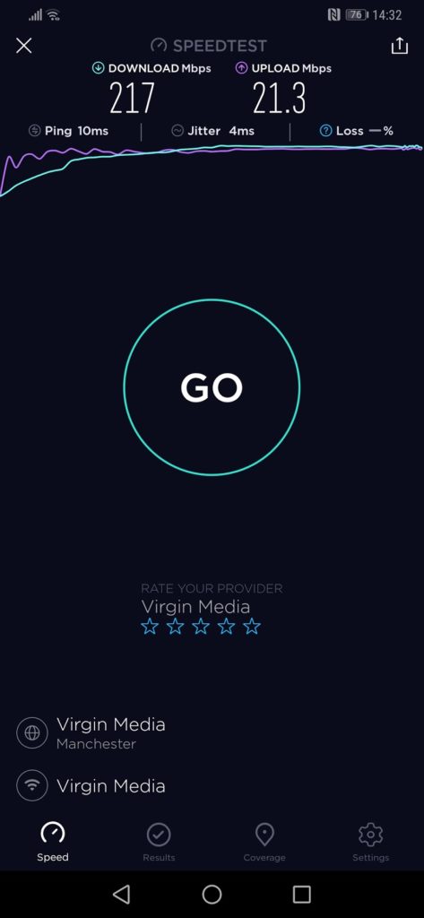 Carrying out the simplest of tests, I went around my house with my Mate 20 Pro and ran the SpeedTest.Net app. I have 350MB Virgin so it can test the Wi-Fi throughput reasonably well.