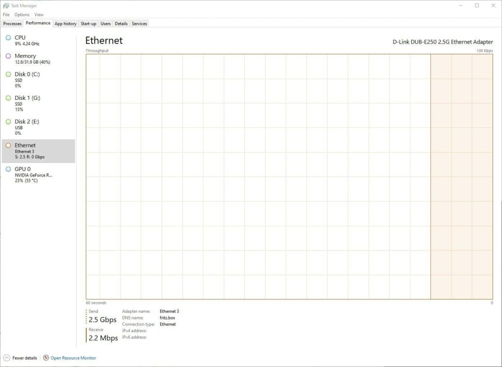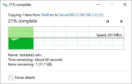 As expected, the D-Link adaptor happily maxes out the connection with transfers sitting steady at 280MB/s and being reported as the full 2.5Gbps within Task Manager.