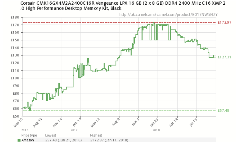 These sound like huge drops but don’t forget that just over two years ago that same 2 x 8 GB DDR4 cost just £57 giving you a 122% increase based on today’s costs.