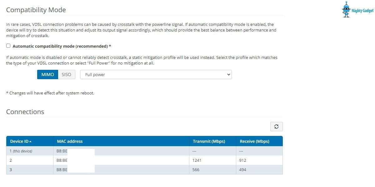 As I use Virgin fibre, I assumed that this wasn’t necessary for me, and I, therefore, set the mode to MIMO Full Power. This then significantly improved the registered transmit and receive speeds.