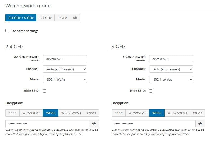 Originally I stated that this did not do sperate channels properly, but a reader kindly pointed out that I missed the small tick box that states use the same settings. With this unchecked, you can run the 2.4Ghz and 5Ghz as unique SSIDs.
