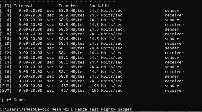 My initial test with one of the devices in the garage was a complete failure. After posting the review, I realised I hadn’t retried it with the new setup. In this scenario, it did work; the speeds were not amazing but far better than the vast majority of mesh WiFi systems I have tried. With this just used a normal internet speed test and I was able to achieve 60Mbps down and 30Mbps up.