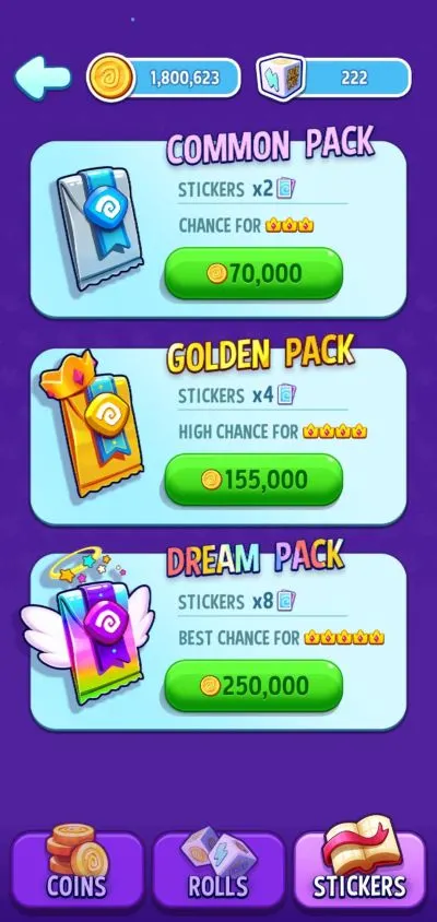 - Players can collect stickers through gameplay, which are grouped into packs. Completing sticker sets rewards players with significant bonuses, such as extra rolls or coins.