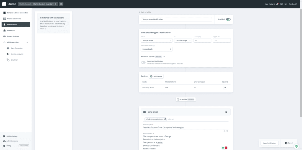 This is a simple email-based system that’s easy to set up. You define what your trigger should be, the conditions to trigger, the devices you want to use for the notification, the schedule, and then what the action should be.