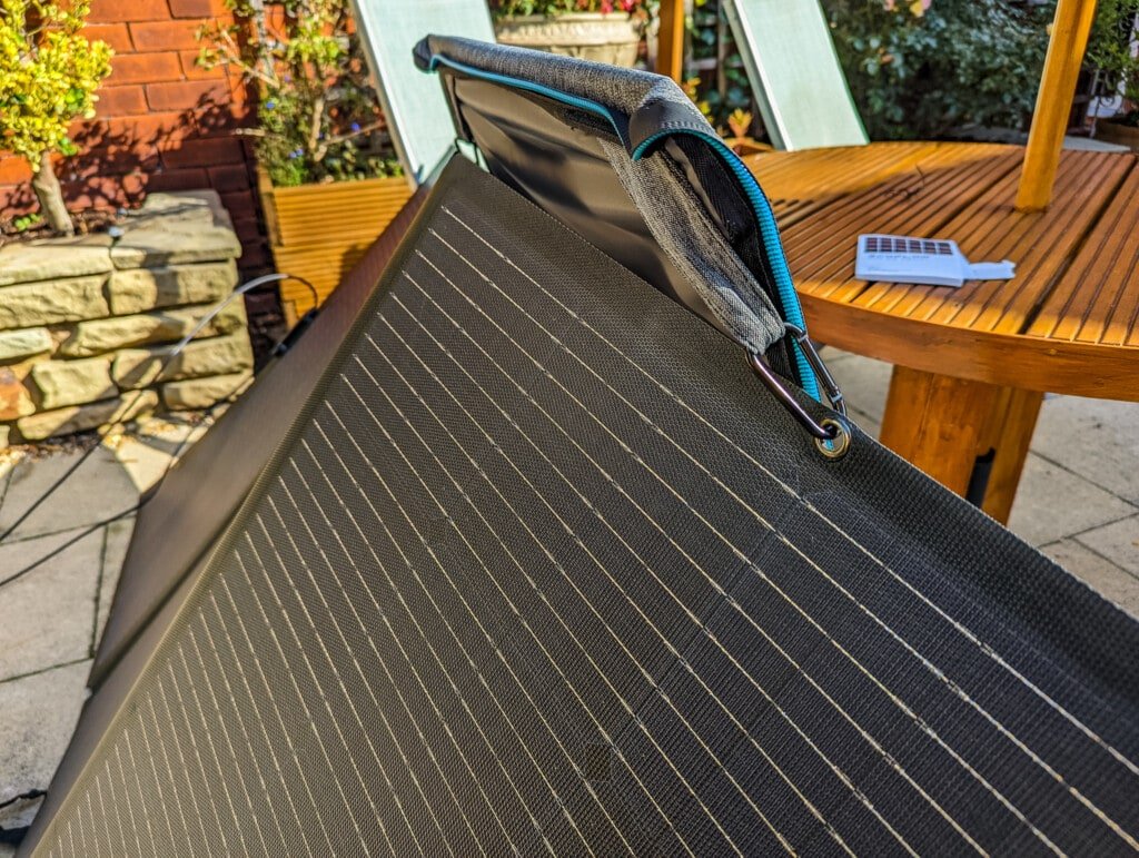 The solar panel consists of four main panels, so it folds down into a quarter of the total size, and it is all contained in a convenient bag with carrying handles. The panel is very thin, so the overall thickness is remains thin, even when folded up. But it is still quite big.