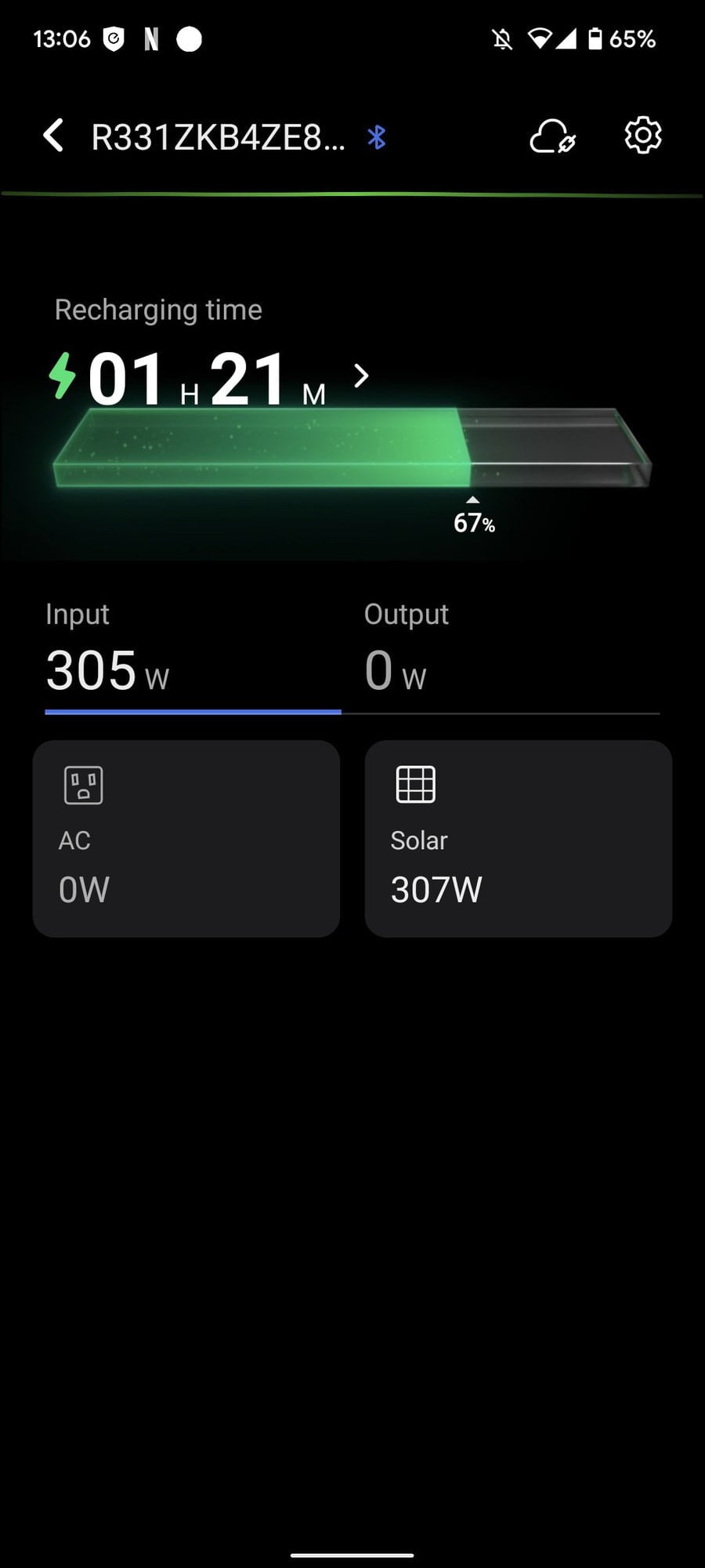 - At 13:05, towards the start of the charge, with the battery at 67% and the input at 289W, the app indicated it would take 1h 26 mins for a full charge.