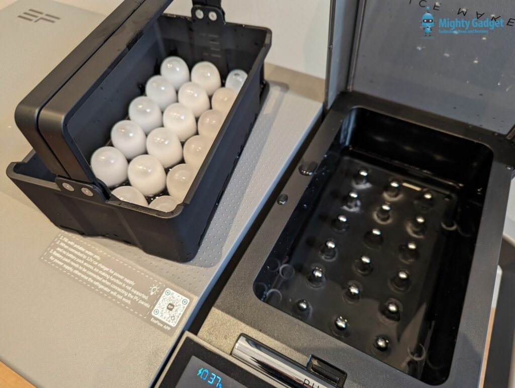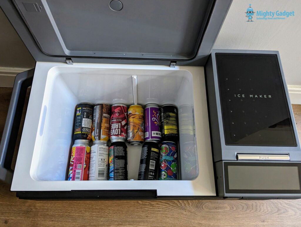 It is one of the only products on the market that is a portable fridge with an optional slot-in battery, making it truly portable without the need for a separate portable power station. It is also the first fridge that has an integrated ice maker that produces 18 ice cubes in approximately 12 minutes.
