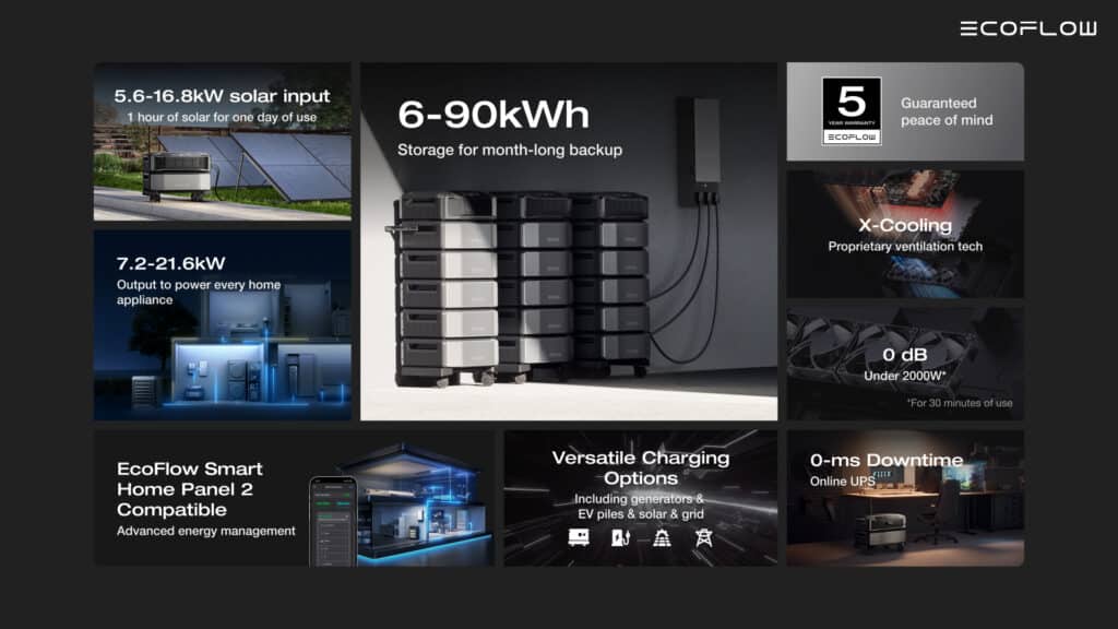 A key advantage of the DELTA Pro Ultra is its flexible and modular architecture. Additional battery units can be stacked to expand capacity from 6kWh up to 90kWh. This modular approach allows users to start small and add more capacity as needs grow.