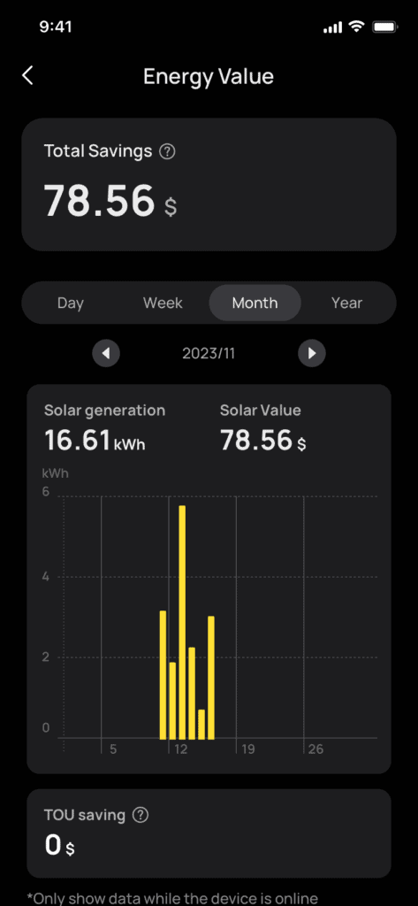 - See live battery capacity, solar production, grid/generator power draw
