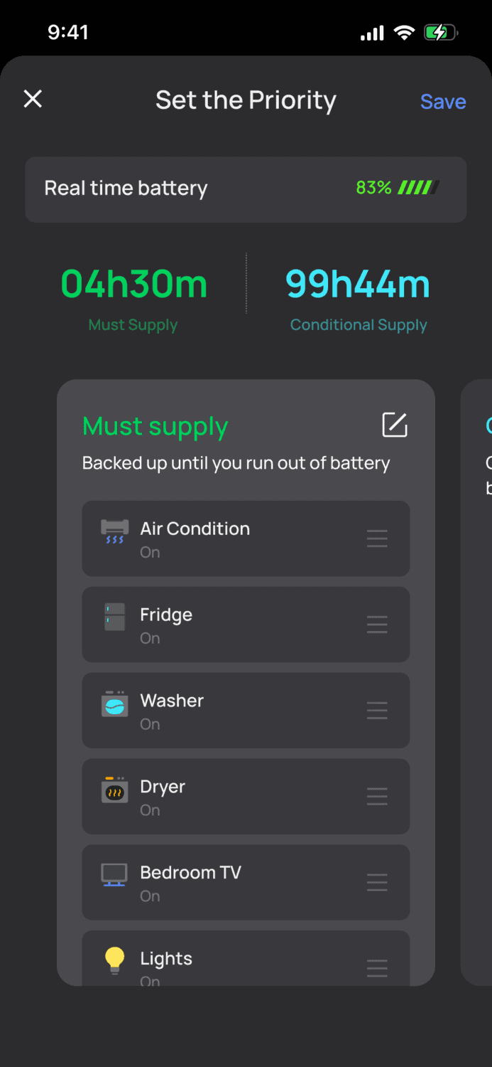 - See live battery capacity, solar production, grid/generator power draw