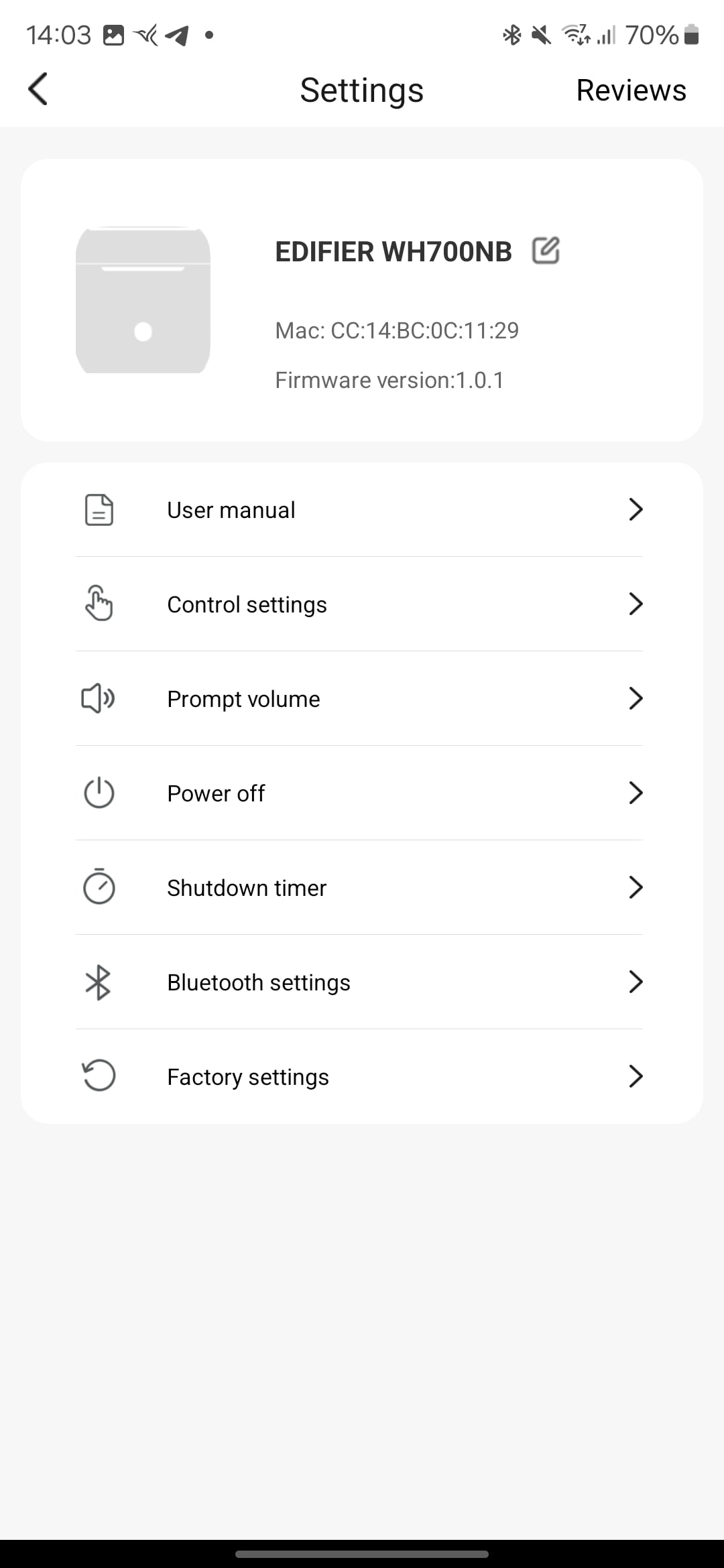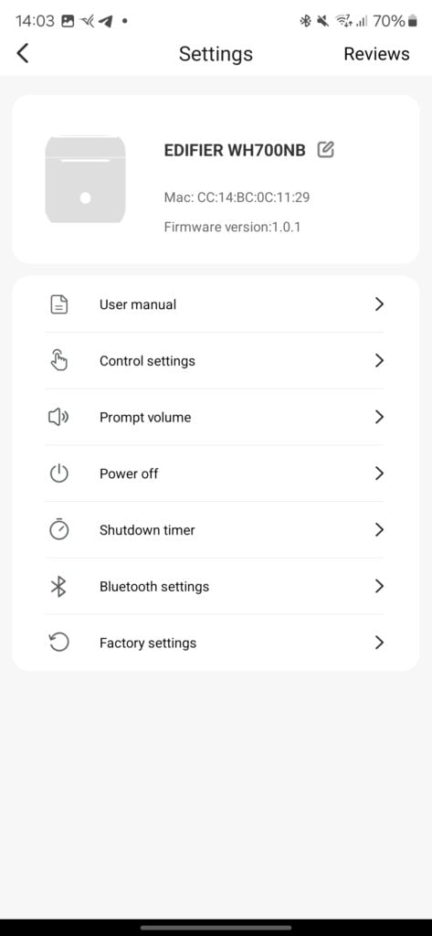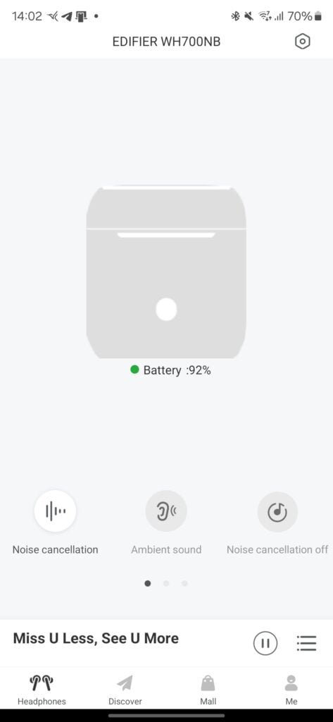 The Edifier Connect app, available for iOS and Android, allows you to tweak various settings on the WH700NB headphones. You can turn ANC on/off, check battery status, enable low latency gaming mode, and choose from sound effect presets like Dynamic, Classic, and Customized.