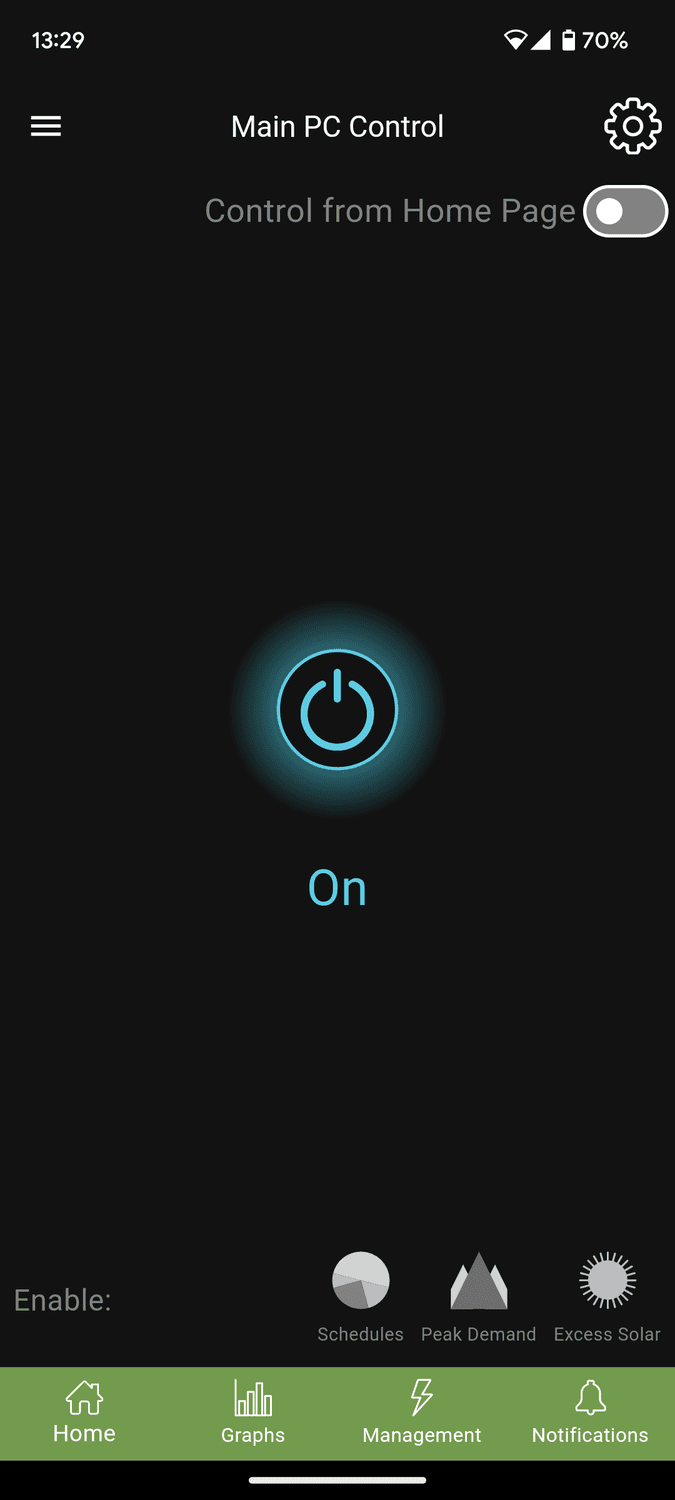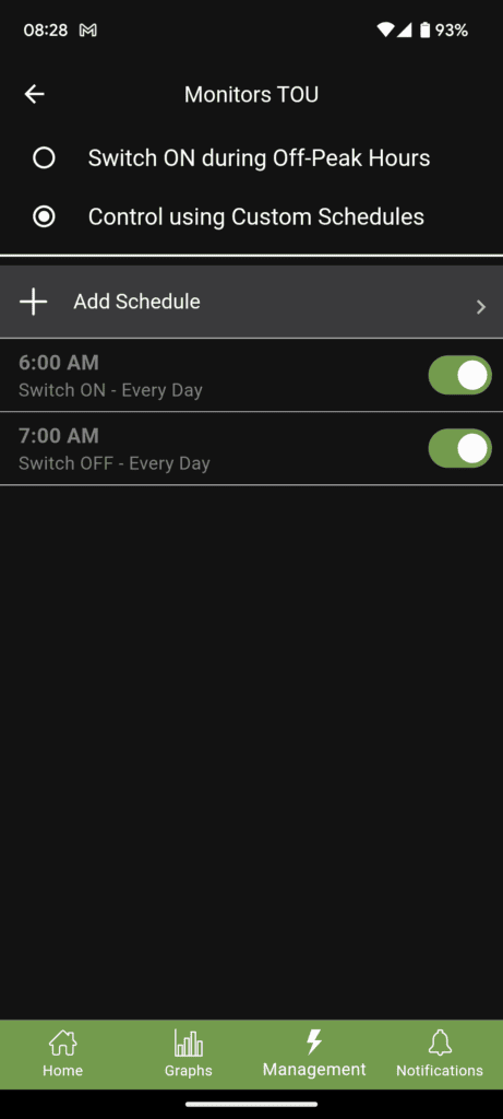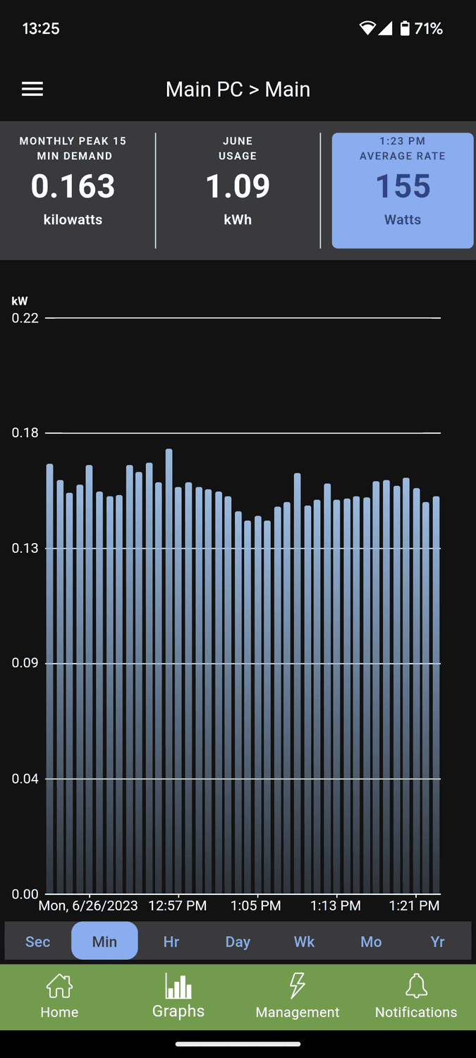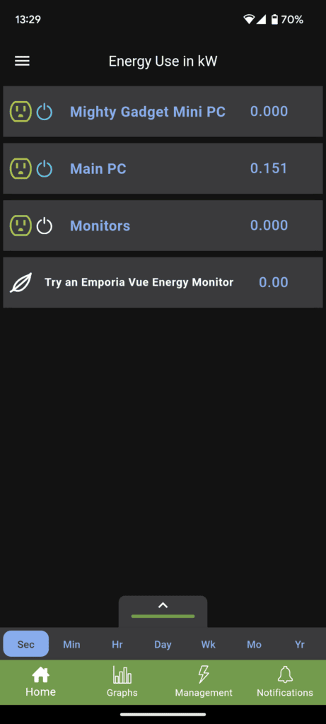 Under the monitoring section, you have the energy use plotted out into a graph which updates in real-time and can be broken down into seconds, minutes, hours, days, weeks, months or year.