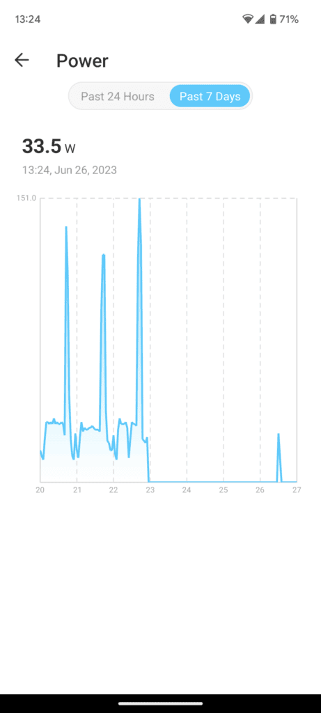 In comparison, the TP-Link Kasa plugs only give you basic information about the current usage, past 7 days and past 30 days. The Tapo app is marginally better as this has graphs for 24 hours, 7 days, 30 days and 12 months, but it is not as detailed as the Emporia plugs.