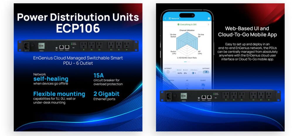 The ECP106 has 6-metered outlets with ethernet connectivity, allowing the PDU to be managed remotely via the EnGenius Cloud.