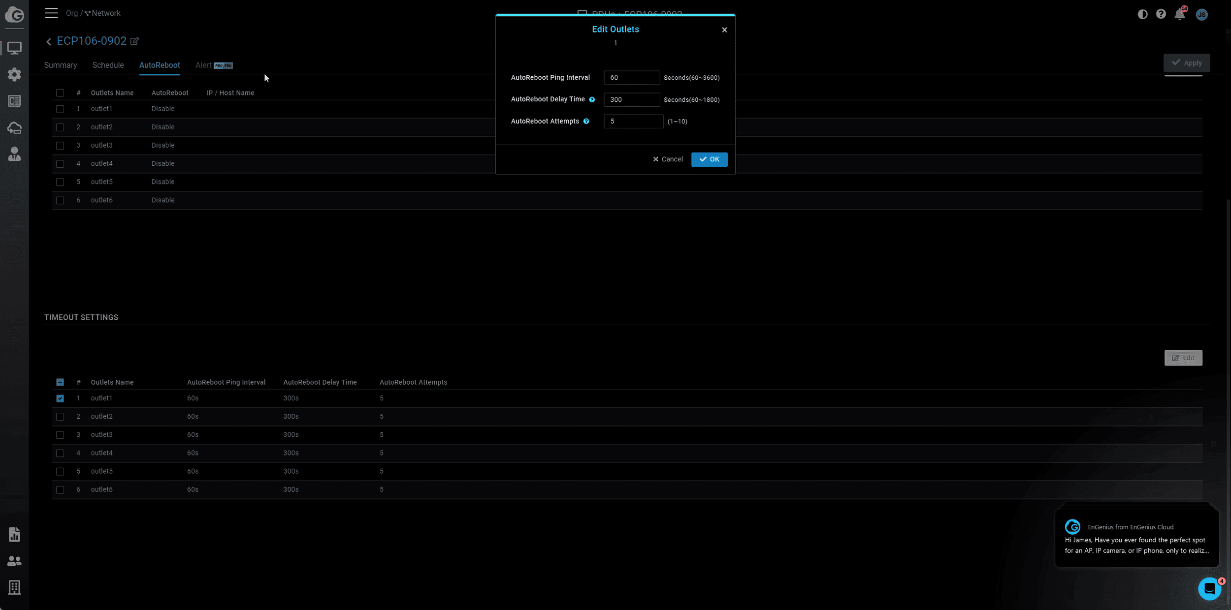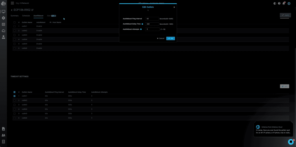 Then, under the timeout settings, you can define how often the PDU will ping the IP/hostname, a delay time to avoid premature power cycles and the number of AutoReboot attempts.