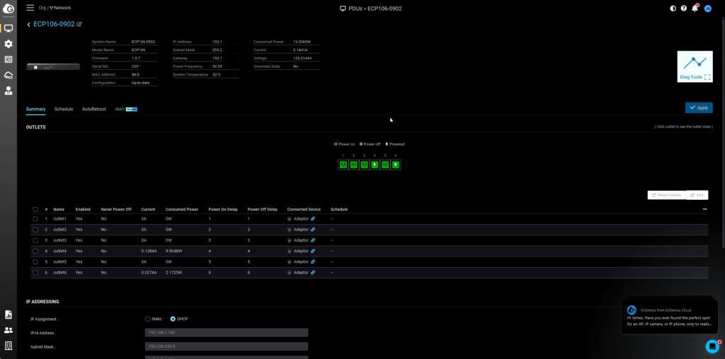 Like most of the EnGenius products, you have the diagnostic tools which show the current usage of the PDU and connectivity testing with Ping.