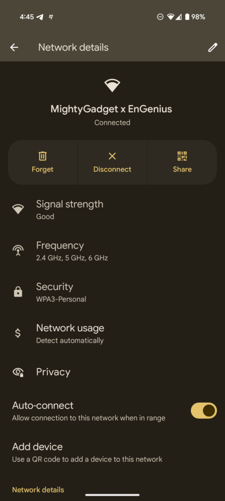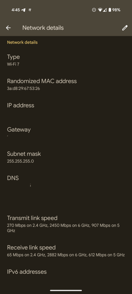Unfortunately, MLO didn’t seem to provide any benefit. For a start, MLO seemed to work intermittently. I noticed the multi-band connection when testing the Pixel in the room below the access point, but when in my office, the Pixel seemed to just connect to 6GHz.