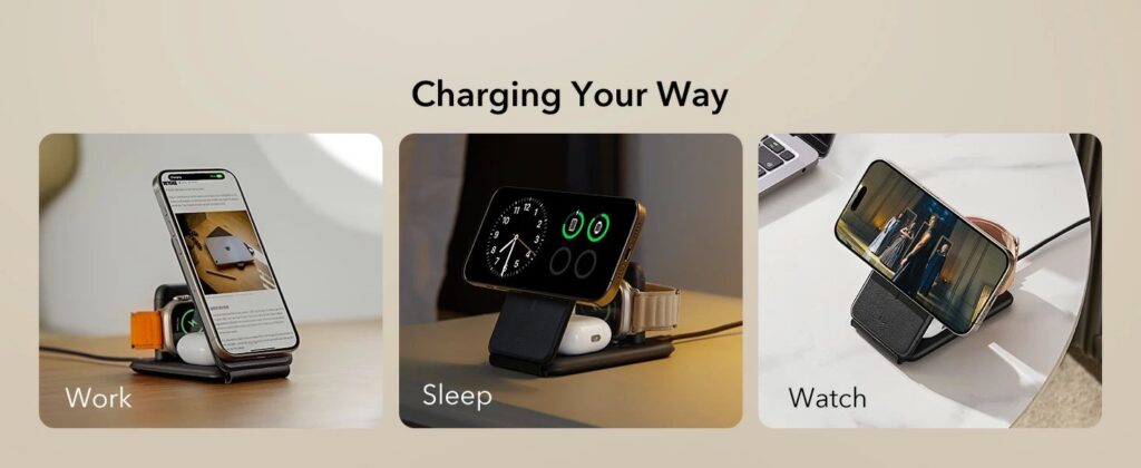 The ESR Qi2 3-in-1 Travel Wireless Charging Set is designed to work with a wide range of devices. It’s compatible with all Qi-enabled smartphones, including iPhones (iPhone 8 and later) and many Android devices. The set also works with Qi-compatible wireless earbuds cases, such as AirPods and various other brands.