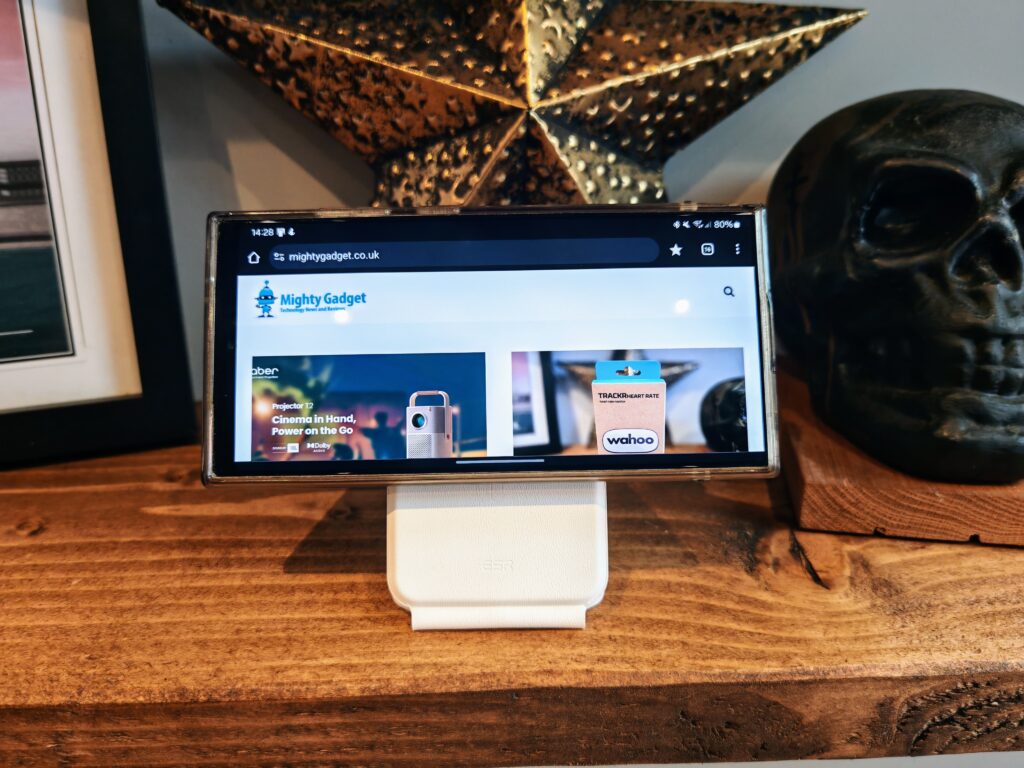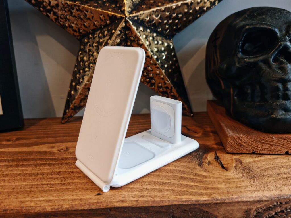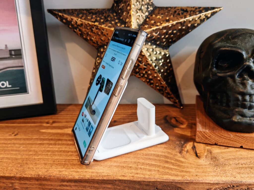 During my testing, I tested it with my partner’s iPhone and Apple Watch, but I also used it with my Samsung Galaxy S24 Ultra, which has a Ringke Fusion MagSafe Magnetic Case that allows me to attach it to Magsafe and Qi2 chargers like this.