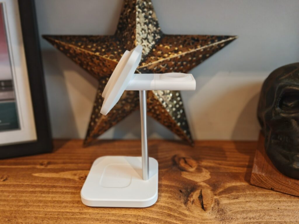 The stand’s layout is well-thought-out, with dedicated spaces for an iPhone, Apple Watch, and AirPods. The iPhone charging pad is angled for optimal viewing, allowing users to easily check notifications or use their device while it charges. The Apple Watch charger is positioned vertically, making it compatible with Nightstand mode. The AirPods charging area is conveniently located at the base of the stand.