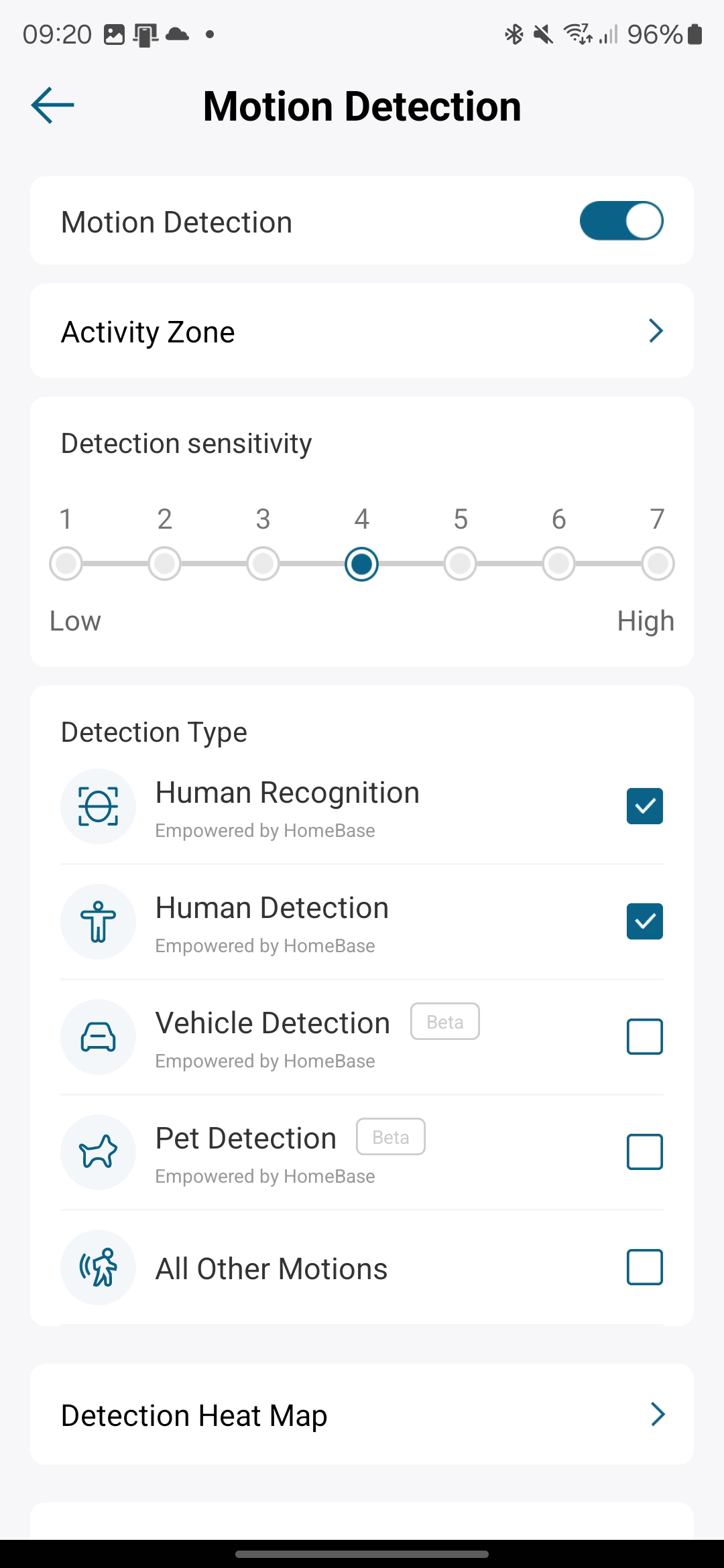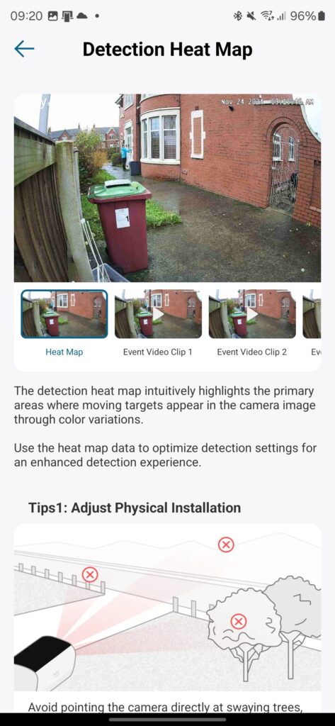 The detection system allows you to set up activity zones, focusing the camera’s attention on specific areas of the frame. This feature is particularly useful for avoiding alerts from high-traffic areas that aren’t of interest, such as a nearby pavement or road.