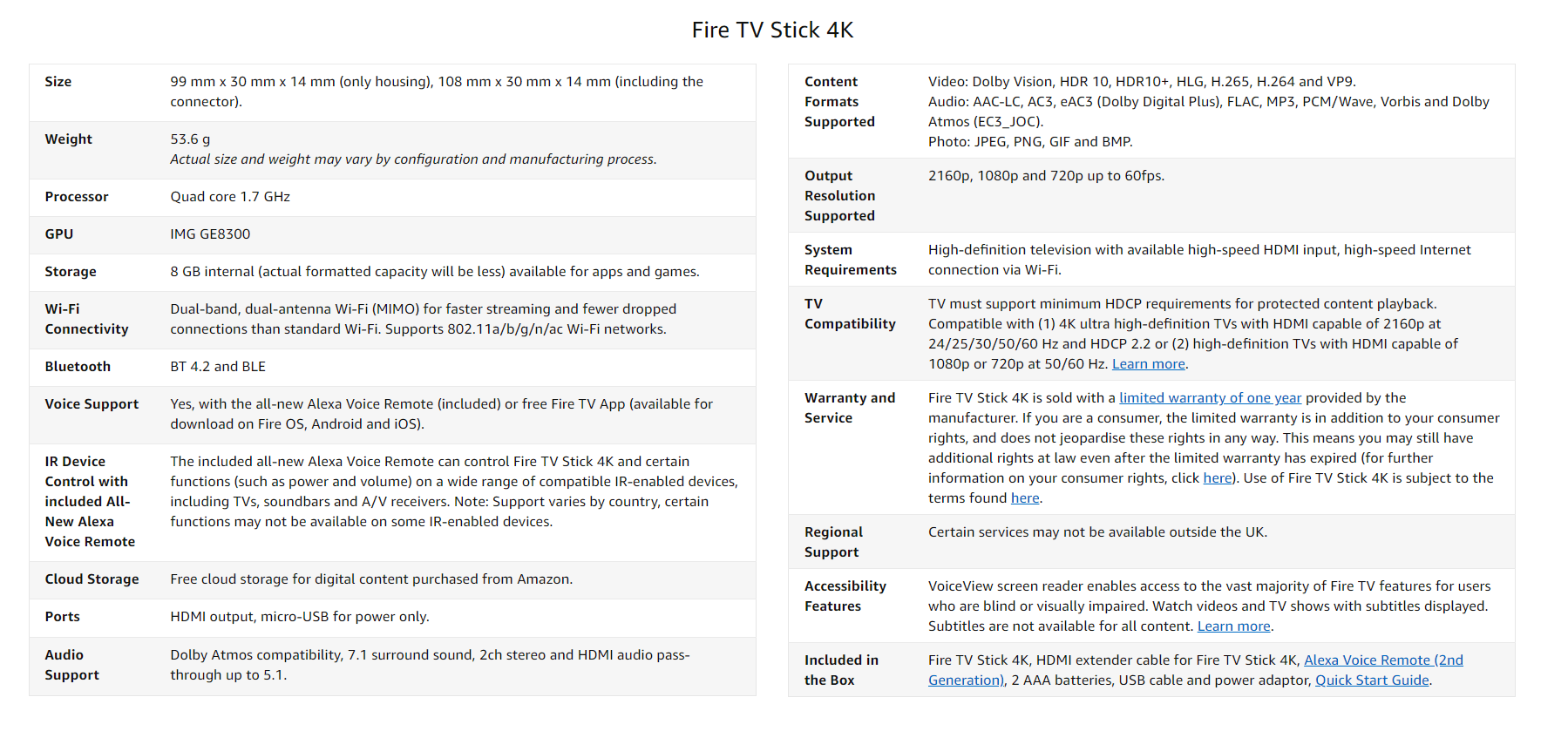 This year’s model has some small but crucial updates; the Fire TV Stick now supports HDR in the form of HDR 10, 10+ and Dolby Vision. As far as I am aware, this makes this easily the cheapest Dolby Vision/HDR10+ device on the market, and the Apple TV 4K is the only other option unless you get a DVD player or an Xbox One X.