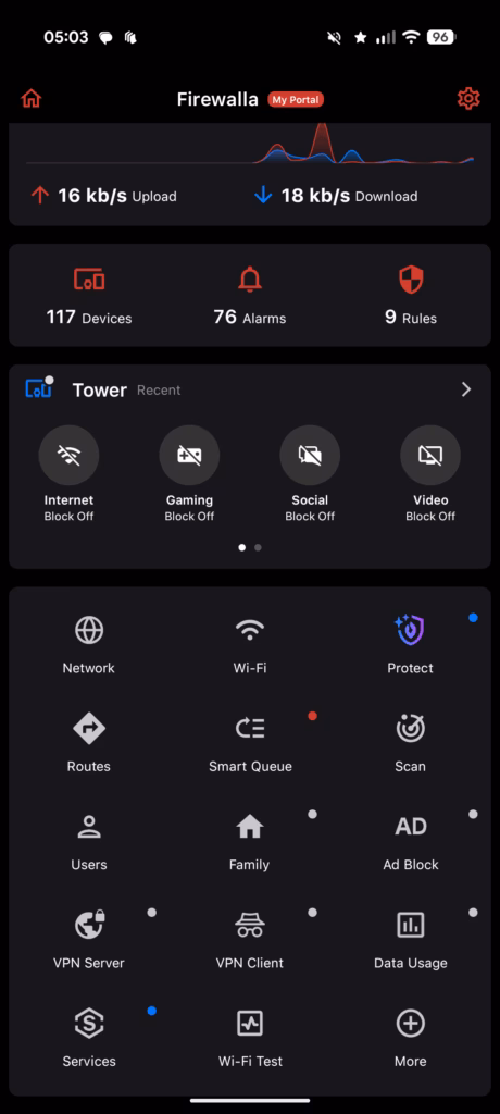 WiFi testing tools integrate directly into the app, providing both signal strength assessment and comprehensive connection analysis. This eliminates the need for separate WiFi analyser apps whilst ensuring compatibility with Firewalla’s specific configuration.