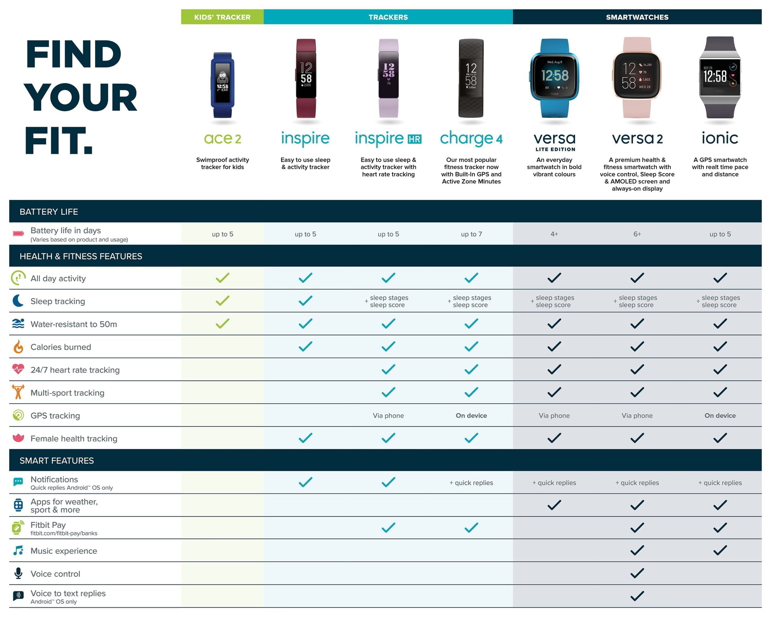 The Charge 4 has the best battery life with up to 7 days of use. When you move onto the Versa series it is 4+ for the Lite then 6+ for the Versa 2.