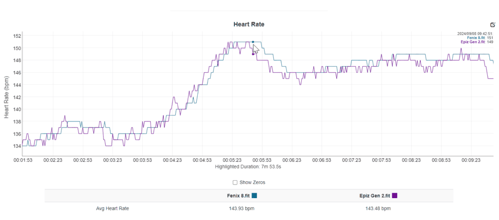 - Steady-state activities: During indoor cycling with steady-state sections and intervals, the Fenix 8 heart rate readings closely matched those of chest strap and arm-based heart rate monitors.