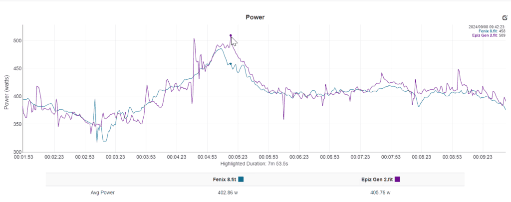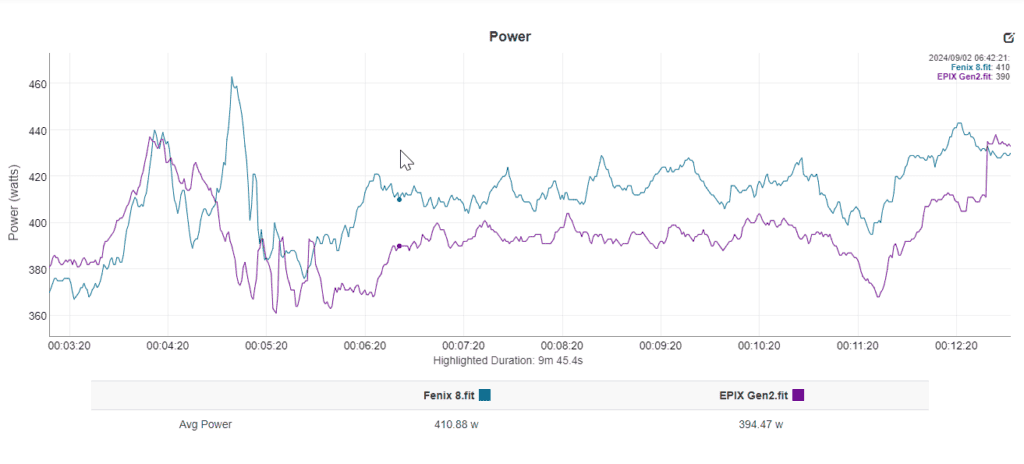 I also looked at the numbers when using the Garmin HRM Pro with my Epix Gen 2 and the Fenix 8. The Garmin HRM Pro appears to record a higher power for runs; in my most recent run, it was around 10 watts different at the start of the run and up to 40 watts difference as I spread up towards the end.