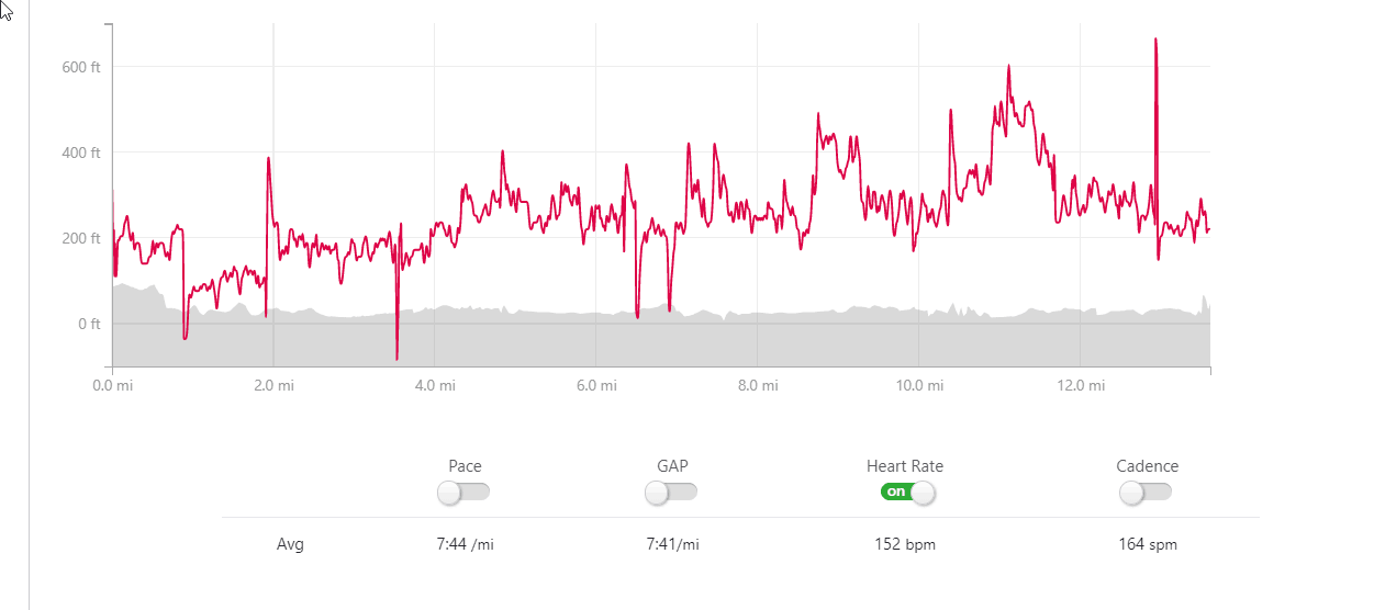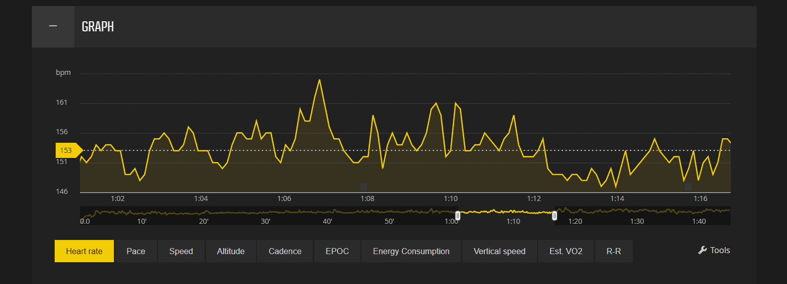 During that same run, the most significant peak with the Suunto was 174, there were less apparent drops in heart rate, but around 6 clear peaks.
