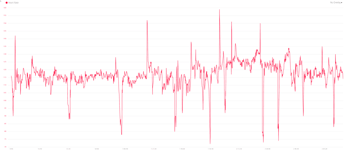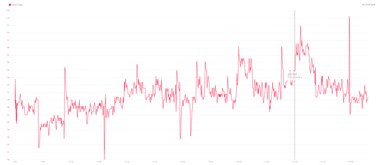 With the Garmin in one of my last runs at the 1h38m mark, it recorded 150bpm then up to 180 at 1h40 and down to 148bpm less than 30 seconds later. During this run, I counted 7 significant drops in heart rate and 9 sharp jumps in it.