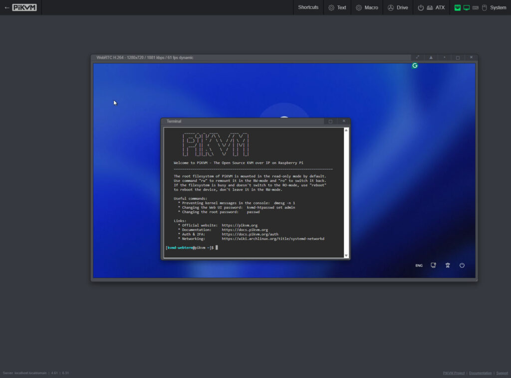 The PiKVM web interface is clean, functional, and focused on providing the necessary controls without unnecessary complexity. Upon logging in, you’re presented with a simple menu offering KVM, Terminal, or Logout options.