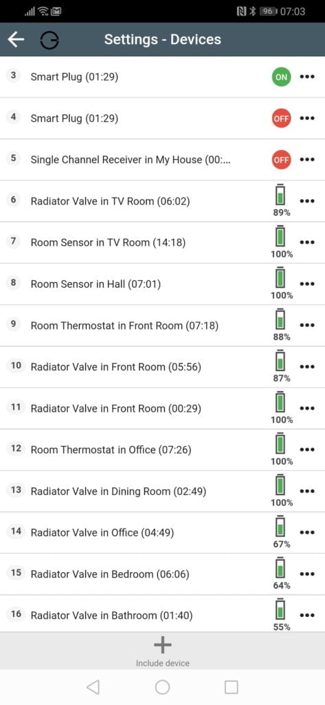 With all the devices, most of which use batteries, you may be concerned about battery life. The app will provide you feedback when a battery is low or dead, and you can also check the status of the battery in the device list, this is another reason why it is good to make a note of the IDs on the device. In general, in the years I have used them, all the valves last at least a year, and I am yet to change a wall thermostat battery, I think they are supposed to last about two years.