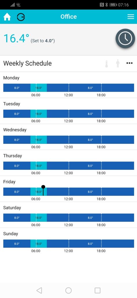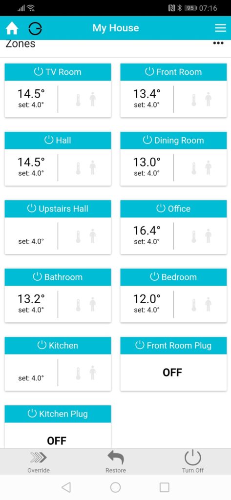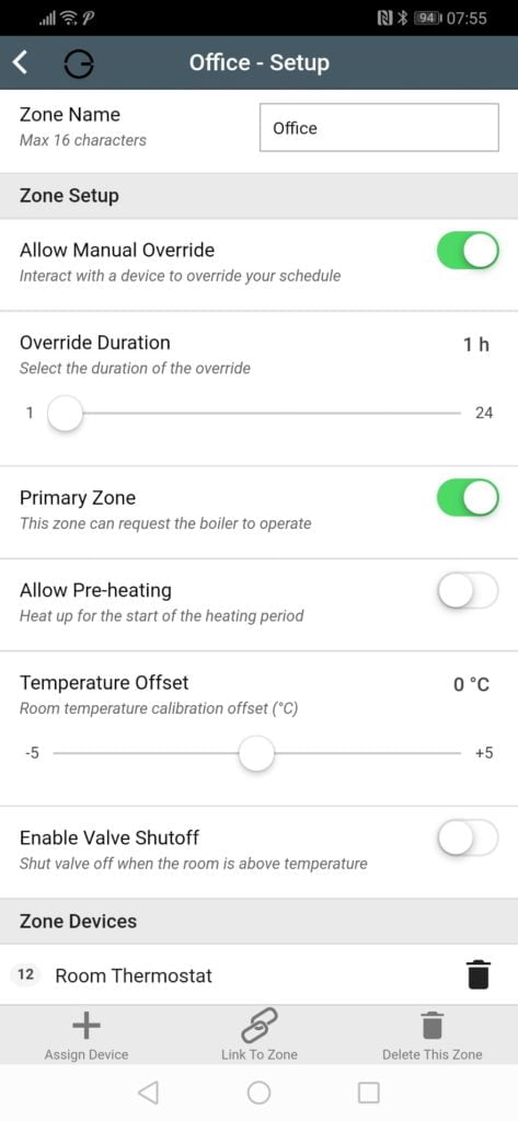 For example, a wall thermostat doesn’t have to be assigned to just one room, if you want to use it in a more traditional sense, you can assign it to the home, or you can assign it to multiple rooms. So for me, I have one for our downstairs living areas which we use in the evening, and then bedrooms and office for the morning. So then when I boost the downstairs thermostat it will raise the temperature in all my downstairs rooms to the new selected temperature.
